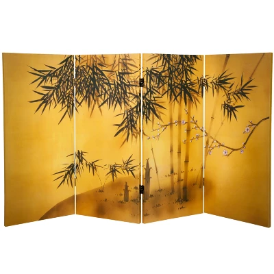 This beautiful folding screen depicts a bamboo grove and a single blossoming plum branch set against a lush golden background on four panels. In Chinese culture, these plants are known for surviving through the winter without withering. They are often depicted together in art to symbolize perseverance, loyalty, and resilience. Printed in high definition on art quality canvas, this stunning three-foot tall folding screen will bring a graceful Chinese accent to any room.
