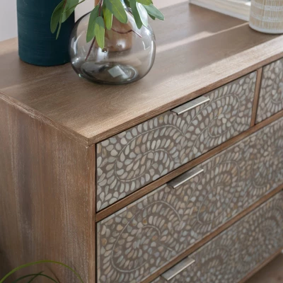 Whimsical and brimming with rustic charm, this 4-drawer console is brought to you straight from the scene of a boho fairytale. Beautiful mother of pearl inlays line the fronts of two small top drawers and the two larger drawers on the bottom. The wooden frame is finished with a glaze that lends itself to a worn, vintage look that fits seamlessly in contemporary settings. Metal handles and drawer glides offer ease of use, rounding out this handy, stylish piece.