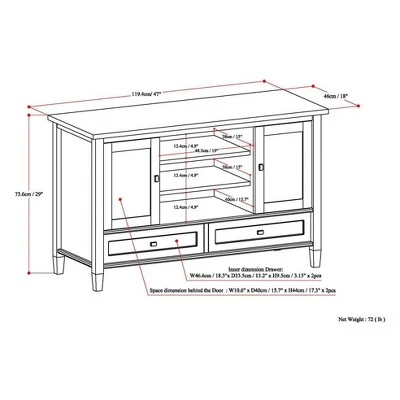 Instantly give your living space a functional and stylish update with this Warm Shaker TV Media Stand from Simpli Home. This hardwood media stand has a rectangular design with ample storage space for all your electronics and their accessories. It has two pull-out drawers, three open cubby spaces stacked vertically in the middle and two small cabinets doors that open to adjustable shelves. There’s several circular cutouts on the back of the stand for all of the cords from your electronic devices to easily slide through. With sturdy wood construction and a simple finish that pairs seamlessly with a variety of decor styles, this hardwood TV stand is the perfect way to add more storage and style to your living space.