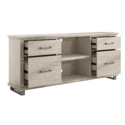 This tall TV stand boasts a sliding barn-door design, and an open adjustable shelf space in the middle. The cable management cutouts ensure that your audio and video cables stay neat and organized. Its ranch-style aesthetic makes it a perfect complement to your existing decor. Elevate both your TV set and your living room with this exquisite TV stand.