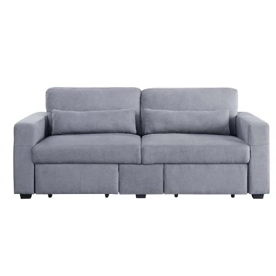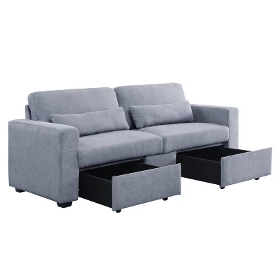 Make the most out of your living room with the Rogyne storage sofa. This sofa is comfortable enough to lounge on for hours on end, and it also adds storage function to your living room. The footrests are convenient storage drawers that can be used to store blankets and pillows. The track armrests help form a modern, clean-lined silhouette. It is upholstered in a neutral gray fabric that is easy to style around and fit into various aesthetics.