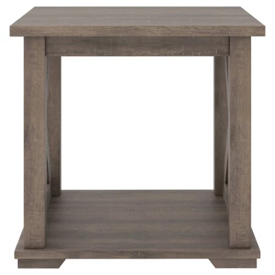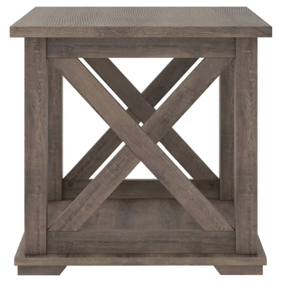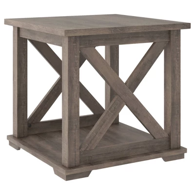 Raise the bar on modern farmhouse design with the Arlenbry end table. Sporting a handsome weathered oak effect and cross buck design, this table makes a statement wherever it lands. With its generous shelved storage space, this home essential is packed with possibilities. Signature Design by Ashley is a registered trademark of Ashley Furniture Industries, Inc.