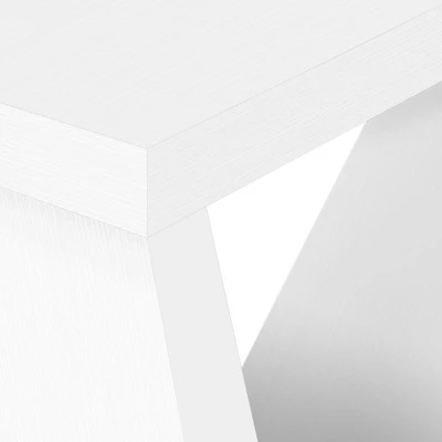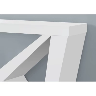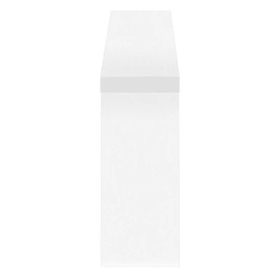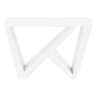 Bring a “wow” factor into your home with this impressive console table. Extra-thick panels in a crisp, white finish give this accent table its big, bold look. The long tabletop is supported by an asymmetrical base in a shape resembling the letter “W”. The thick, wedge-shaped legs and support panels of the base intersect to create two geometric-shaped openings that offer an airiness to balance the table’s hefty appearance. While this contemporary table may look substantial, its space-saving design won’t take up too much room when placed against a wall in a living room, an entryway, or a hallway.