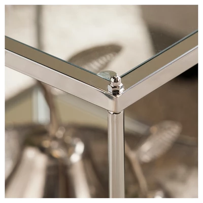 Whether placed beside your couch or sidled up against a bare wall, the Benton Glam Mirrored End Table from Aiden Lane instantly spices things up in your living room. Featuring a minimalist design and sleek lines, this glass end table features a smooth glass tabletop supported on a chrome-plated metal frame, which brings a contemporary flair to your interiors, while the lower glass shelf adds another layer for displaying decor pieces and antiques. A stunning piece to transform your living space, this modern glass end table brings a glamorous focal point to your interiors.