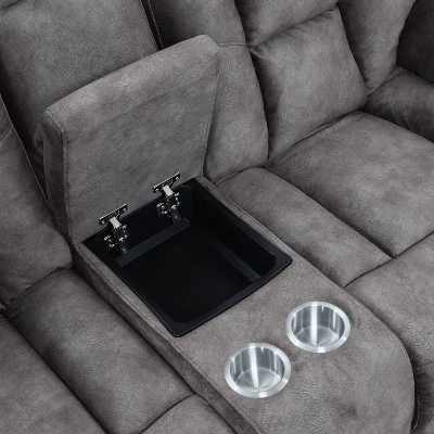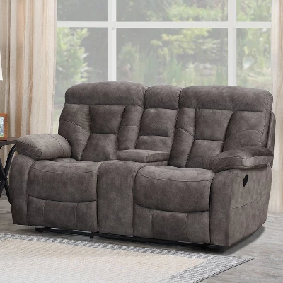 Reclining comfort is yours with the Bogata Recliner Loveseat with Console. Comfortable seating is ensured with the pocketed coil seat springs and memory gel foam seat cushions. The center console features lift top storage for remotes or other items and two cup holders. The mushroom colored upholstery is soft to the touch and easy to clean so you can relax and enjoy.