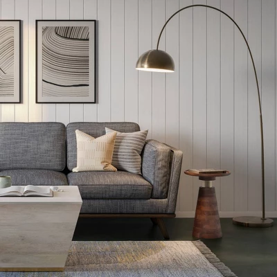 - Multi-functional table features spacious round solid acacia top, antique brass look stem and solid acacia cone shape pedestal base