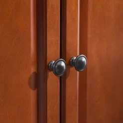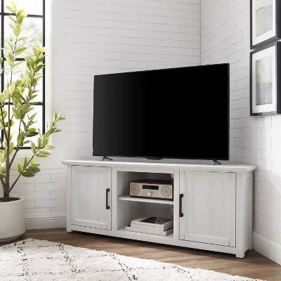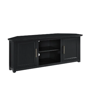 Ideal for smaller living spaces, the Camden Corner TV Stand tucks neatly into any corner. Featuring two cabinets with an adjustable shelf in each, this stand is ready to corral your books, video games, or other media. The open storage in the center offers an adjustable and removable shelf with two pre-cut holes in the back for cable management. Sized to fit most TV’s up to 60 inches, the Camden Low Profile TV Stand exudes rustic style with the look of wood-grain and substantial metal hardware.