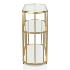 With a post-modern vibe and a striking color combination, this sofa table from the Chetwood collection is perfectly suited for a modern style living space. Two-tone of glossy white and natural-like wood surfaces complete this ultra-modern look, lending itself nicely behind a sofa or even set within an entryway foyer. Additionally, with a stacked shelf design, you can tuck away your books and magazines in one of the two open shelves below or add decor to display.