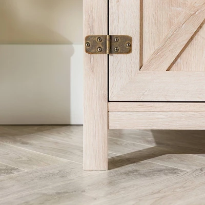 Bring a cozy aesthetic into your home with the Clarabelle 44″ Rustic Farmhouse Barn Door TV Stand from Saracina Home. The barn door-inspired cabinet and open shelf offer a convenient blend of open and closed storage where you can proudly display your media components or tuck away clutter. Adjustable shelves mean that you can set up this entertainment unit to your liking. Antique-finish metal accents on the corners and hinges subtly emphasize the rustic theme. Use as a TV stand to support up to a 50-inch TV in your living room or as a mini buffet in the dining room.