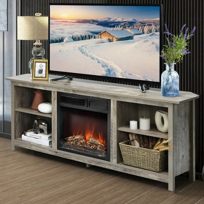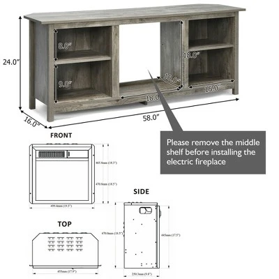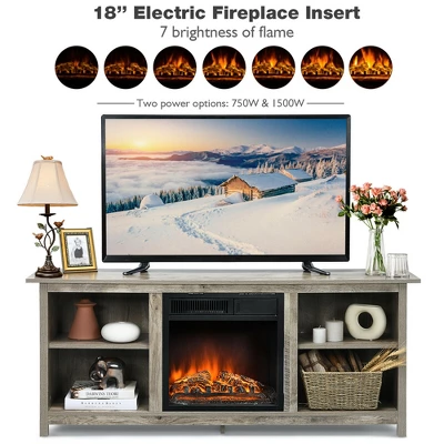 Costway 58” 2-Tier Fireplace TV Stand W/18” Electric Fireplace Grey Up To 65”