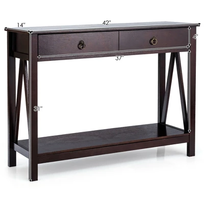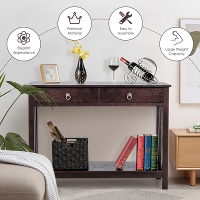 This classic 2-tier console table is an unmissable choice for you! Crafted from premium pine wood and sturdy MDF board, our table can long-term use. Unique frame design on both enhances the stability. Anti-toppling device also provides effective protection for children in your home. Big drawer and bottom shelf accommodate kinds of items to help you have a good classification. Spacious tabletop provides platform for displaying. Our classic sofa table looks simple and generous, which is high compatible with home decor. Retro style brings a sense of elegance to your room. The installation is easy with detailed instruction.