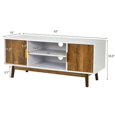 The perfect combination of white board with rustic oak wood grain delivers a charming feeling to seamlessly match your home surroundings. Not only can this media console be used as a TV stand to support flat screen TV up to 50 inches, but also be suitable for living room to store home necessities. Enclosed cabinets and open shelves achieve the perfect balance between private storage and convenient display. All of your media players, DVDs, audio equipment and routers can find their perfect storage space. There are 2 pre-drilled cable holes to help organize the wires and cords of different devices. Say goodbye to the visible messy surroundings and enjoy a fun leisure time with your family.