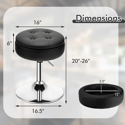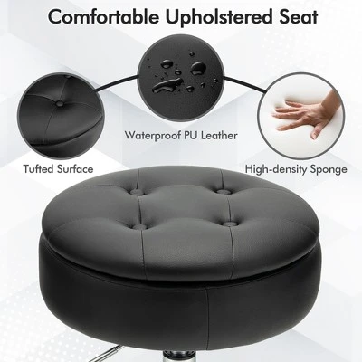 Take this chic and comfortable vanity stool home to complement your bedroom! The height adjustable stool easily matches desks of different heights. And with the convenient control lever, it’s easy to operate and adjust the height! What’s more, the soft-padded seat will greatly improve the seating comfort. Besides, the high-end PU leather and tufted design make the stool look of great value. On the other hand, the seat lid is removable and there’s a storage compartment to bring you some convenience. Flip the lid over, the plywood top can be used as a tray for the afternoon tea! In addition to the above advantages, the upholstered storage ottoman also boasts it superior stability thanks to the stable plated chassis, which is enhanced with non-slip rubber pads for floor protection.