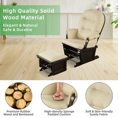 Sit down comfortably and enjoy the smooth rocking motion with our glider and ottoman set! Crafted from a natural and solid wooden frame, our rocking chair is sturdy and durable enough to serve you for a long time. Gentle rocking motion will provide optimal relaxation and fun for you. Thick sponge padded cushions and soft fabric can bring you luxurious comfort. And you will sit comfortably and feel relaxed with wide backrest, cozy armrests and matching ottoman. Besides, the cover of seat cushion can be removed with a smooth zipper for easy cleaning. The multipurpose design and modern style enable you to use this set in the living room, balcony, nursery, etc. Enjoy your leisure time and rocking fun with this glider chair set!