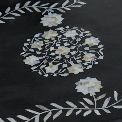 - This narrow console table showcases a reliable construction of stainless steel and medium-density fiberboard, the tabletop is inlayed with oyster shell forming flowers and diamonds