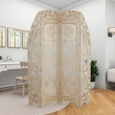 An eclectic style carved wood screen will be a great addition to your living space as a privacy divider or as added decoration on empty walls. This item ships in 1 carton. Folds into 4 panels for easy storage. Due to the handmade nature of this item, no two will be alike, there will be slight differences in shape, size, and color. Suitable for indoor use only. This item ships fully assembled in one piece. Made in India. Item features 4 panel screens. This is a single white colored folding panel partition. Eclectic style.