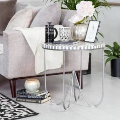 - Small, round accent table tucks neatly into any space without taking up too much room.