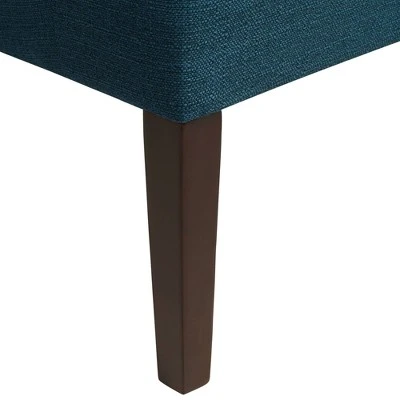 A contemporary-style upholstered armchair that’s perfect for living room, dining room, and seating area use. This stylish design comes in a bold blue fabric and features dramatic swoop arms. The brown wood legs are a lovely contrast that adds to the look.