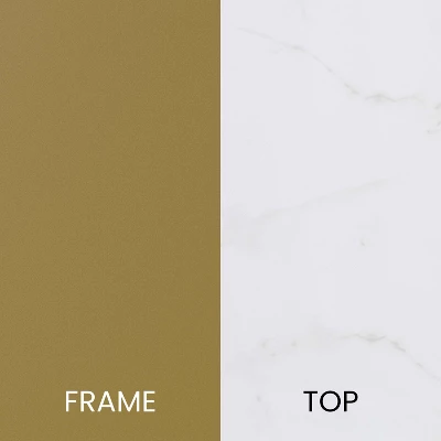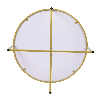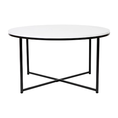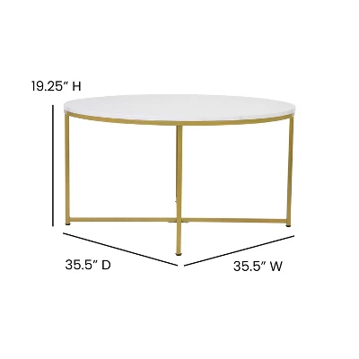 Update the atmosphere in your home with the sophisticated, polished look of this mixed media coffee table. Featuring a marbled white finished laminate top, this occasional table blends seamlessly in any space. The round shape atop modern crisscross brushed gold metal legs completes the overall look of this stunning piece. Whether you’re serving coffee, tea, or just want a place for decorative items, you will never have to worry about the safety of this table. The strong .5 inch thick engineered wood top stands up to daily use while the sturdy cross brace metal frame holds up to 55 lbs. static weight capacity. A durable powder coated finish ensures this living room table will look great for years to come. Have your new coffee table ready to use in under 30 minutes with the included step-by-step instructions and included tools. Floor glides will protect your hard flooring surfaces from scuffs and scrape and messes clean up quickly and easily with a water based cleaner.