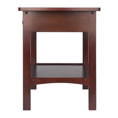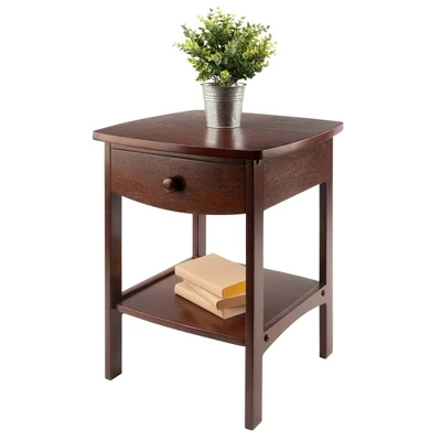 Timeless in design and function, this handsome end table is useful in just about any room of the house. The single drawer features a simple round pull an is great for holding your remote control, viewing guides, a deck of cards and more. The slightly rounded cut adds interest. Made from solid wood and available with either a black, natural, walnut or white finish. Imported. Assembled size is 18″W x 18″D x 22″H. Table comes with one drawer with inside dimension of 12″W x 13.8″D x 2.3″H and a shelf with surface size of 13.3″W x 14.9″D. Available in White, Black, Walnut and Clear wood finish. Assembly Required.