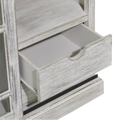 - Features a wooden cabinet with four separate shelves, two drawers, a clear glass door, and iron metal accents