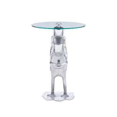 Hop on partner, we’re headed to a new pad! This outlandish side table is sure to turn heads and create smiles. The clear tempered glass top is 8mm thick and supported by two sturdy frogs in the semi polished aluminum base, here to lend a hand through many a cocktail party. Measuring at 17.5” L x 17.5” D x 24” H, it fits perfectly next to a couch or set of chairs and is guaranteed to be the life of the party whether placed in a living room, foyer or home bar.