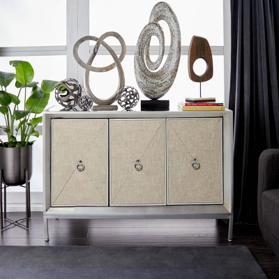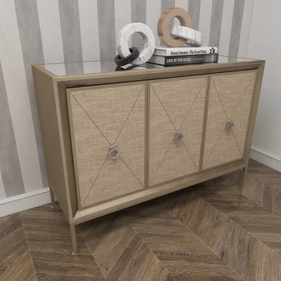 A practical yet stylish upgrade that instantly elevate the look of your room. Maintain a clutter free zone and stay organize with this chic cabinet. Create an elegant display with this large upholstered sideboard and decorate it with a metal object on top of books next to a large ceramic vase. This item ships in 1 carton. Suitable for indoor use only. Maximum weight limit is 30 lbs. This is a single cabinet. Mdf cabinet features 2 shelves. Glam style.