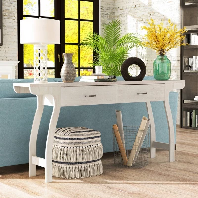 A transitional console table mingles into a hallway for a convenient stash-away place. Two spacious drawers on smooth metal glides offer space for keys and mail. With a curved silhouette, a gorgeous white oak finish, and classic black bar pulls, this hallway console makes quite the addition to your home.