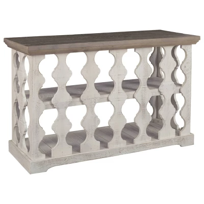 Make an entrance in an entryway or grace a main living space with this wonderfully versatile console sofa table. With its richly rustic finish and textural mix, this sofa table goes to town on bygone beauty. Distressed two-tone treatment blends a weathered gray with vintage white for an utterly charming effect. Balustrade-style planks supporting the top create an eye-catching look that’s anything but ordinary. Stylish and affordable furniture and accessories are more than a dream. For more than 70 years, Ashley Furniture has furnished millions of homes, one beautiful piece at a time. We design and build furniture, then test it for lasting quality and functionality—so you’ll love the look and the price. Signature Design by Ashley is a registered trademark of Ashley Furniture Industries, Inc.