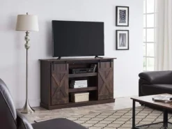 Add the charming appeal of a rustic farmhouse to your home with the Sawyer TV/Media Console. The Sawyer features three open shelves for housing your cable box, DVD player, and other electronics, while its two side cabinets offer additional storage. Functional rolling barn-style doors provide decorative appeal while also concealing your DVD collection and other electronic/accessories. Integrated cord management channels keep all your wires and cables hidden. Assemnbly is quick and easy with the included instructions.