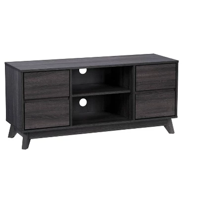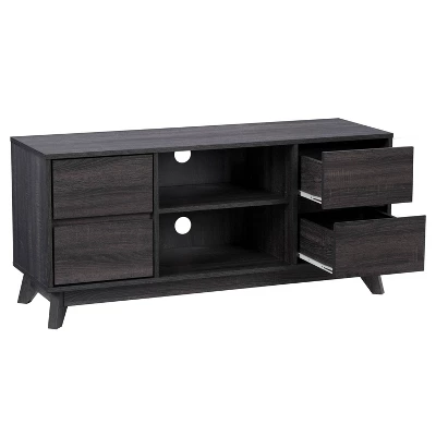 Take your living room to the next level with this stylish modern TV stand. Made with flared wood legs, four drawers, and four open shelves for a mid-century modern appearance. This entertainment center creates additional storage space in your home for media, electronics, accessories, books, or decor. The beautiful rich wood grain finish looks great in any aesthetic. This bench fits most TVs up to 55″ and is the perfect combo of classic colors and modern lines.