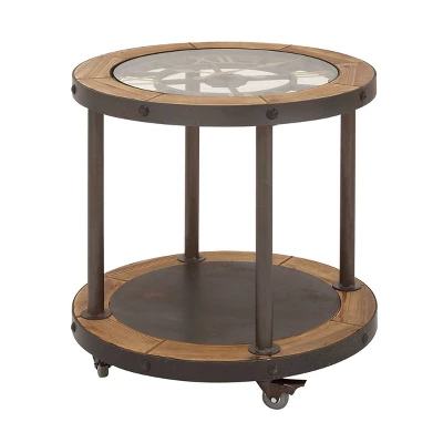 - •Round wooden accent table features clear glass top, brown wood panels, black frames with gold metal accent
