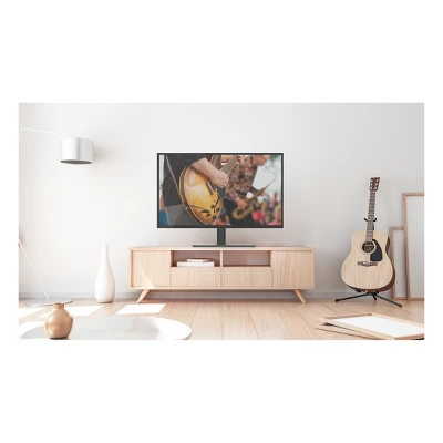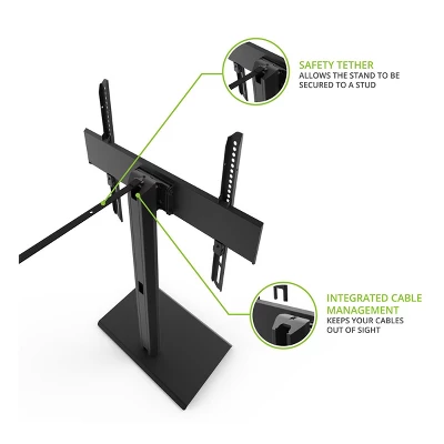 When mounting your TV to the wall isnt an option the TTS100 tabletop stand provides the next best solution. Designed to sit on top of an entertainment center this mount and base combo serves as an improvement to the basic stand included with most TVs. Its height-adjustable support column allows you to raise the center of your TV up to 25.6 inches providing room for a soundbar or other AV equipment. It also offers up to 60 of swivel to improve line-of-sight while seated at an angle. The TTS100 includes integrated cable management for a tidy setup and an optional safety tether for added security.FeaturesFits most flat panel TVs from 37 to 65Supports TVs up to 88 lb (40 kg)Accommodates VESA sizes from 100×100 to 600×40030 of swivel in either directionAccessible tilt mechanism provides -5 of backward tilt angleHeight adjustable between 9.8 (25 cm) and 25.6 (65 cm) depending on screen sizeSecurity tether allows the stand to be secured to a studAdjustable rubber feet add stabilityIntegrated cable managementSolid steel and aluminum construction with durable powder-coated finishAssembly manual and all TV mounting hardware is includedFive-year manufacturers warrantySupports up to 88 PoundsDesigned for 37 to 65 TVs the TTS100 safely supports up to 88 lb.Height AdjustableRaise the center of your TV up to 25.6 to provide room for a soundbar or other AV equipment.Safety TetherFor further prevention against tipping use the provided nylon strap to secure the mount to the wall.Integrated Cable ManagementEasily hide wires and cables by routing them through the interior of the support column.Tilt and SwivelTo improve line-of-sight while seated at an angle the TTS100 can swivel up to 30 left or right depending on screen size. It also provides 5 of backward tilt to help reduce glare.What’s in the BoxTTS100 Adjustable Table Top TV Mount with Integrated Cable Management for 37″ – 65″ TVOptional Safety StrapAssembly ManualMounting HardwareSpecificationsFits most flat-panel TVs from 37 to 65Supports TVs up to 88 lb (40 kg)Accommodates VESA sizes from 100×100 to 600×40030 of swivel in either directionAccessible tilt mechanism provides -5 of backward tilt angleHeight adjustable between 9.8 (25 cm) and 25.6 (65 cm) depending on screen sizeSecurity tether allows the stand to be secured to a studAdjustable rubber feet add stabilityIntegrated cable managementSolid steel and aluminum construction with durable powder-coated finishAssembly manual and all TV mounting hardware is includedFive-year manufacturers warranty