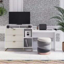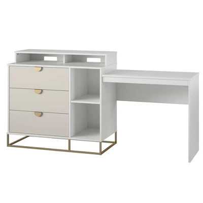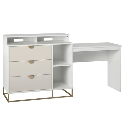 “Nostalgic Hollywood glam mingles with eclectic Art Deco in this luxurious line of bedroom décor brought to you by Novogratz. The Kelly Collection is a modern minimalist’s dream come true with classic neutral tones and brassy gold accents. Constructed from ultra-durable MDF, engineered wood, and powder-coated metal, this multi-functional Media Dresser offers a fresh contemporary spin on four combined pieces of furniture, at one accessible price point. Components of the Media Dresser include a TV Stand, 3 Drawer Dresser, small Bookcase, and Computer Desk all in one! The TV Stand can accommodate a TV up to 39” or 40 lbs. and offers an open cubby below with wire cutouts in the back for your cable box or gaming system. The 3 dresser drawers are perfect to tuck away clothing, blankets and spare linens. Each drawer is equipped with durable metal slides and finished inside with a linen look paper to prevent clothes from snagging on raw edges. Open your laptop and finish your homework at the Desk on the right side of this versatile item. Between the Dresser and Desk is a small Bookcase with 1 adjustable and 1 fixed shelf to hold your textbooks, favorite novels and decor. Half-moon drawer pulls, and an open geometric frame adds the perfect pinch of whimsy to this glamorous collection, creating not only an elegant bedroom ensemble but a work of art that is both classic and fun.