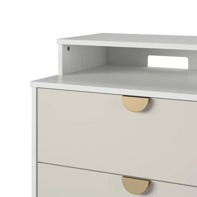 - The 4 in 1 Media Dresser offers 4 pieces of furniture for 1 accessible price; Modern & minimal with classic neutral tones and brassy gold accents, half moon drawer pulls, and an open geometric frame to add the perfect pinch of whimsy; Constructed from ultra-durable MDF, engineered wood, and powder-coated metal