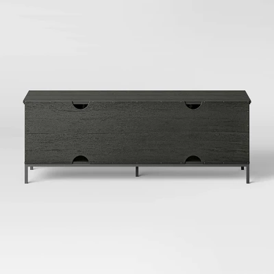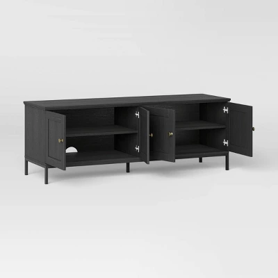This Ketton Media Stand from Threshold™ is the perfect decorative and functional solution for your home entertainment system. Sporting a weathered black-finish silhouette that complements a variety of furniture styles and color palettes, the wood-finish TV stand can hold televisions up to 65 inches wide and features two cabinets with shelves for ample storage space. Each cabinet has double doors paired with gold-finish pull knobs for a stunning look, along with cutouts at the back for managing cords and cables.