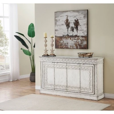 Greek romance meets modern glam with our four door credenza, sure to be an admired focal point in your home. With its rub-through finish in Athens White, this is a statement piece that is both a visual and textural delight with Greek Keys detailing the outer edge. This piece also provides plenty of storage with its two adjustable interior shelves. Make a statement in any room with this one-of-a-kind credenza.
