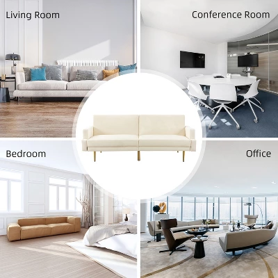Introducing our modern-style convertible sofa sleeper, a versatile addition to any home. Its elegantly shaped track arm adds a touch of sophistication to the chic design and handsome silhouette. Supported by sturdy metal tapered legs, this multifunctional sofa effortlessly transforms from a comfortable sitting spot to a relaxing lounger or even a cozy sleeping space for guests. Crafted with vegan leather, it offers an easy-to-clean and comfortable contact surface. Perfectly suited for the living room, guest bedroom, or home office, this sofa bed seamlessly blends style and functionality, making it a must-have piece for any contemporary living space.