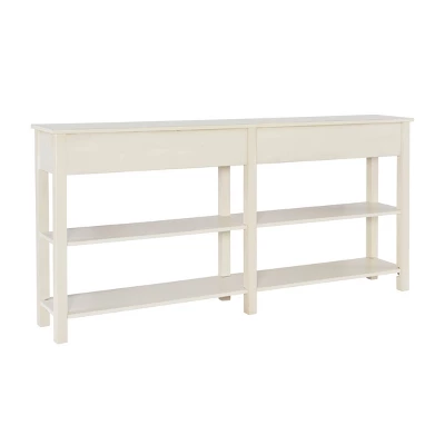 Highlight any space with a Farmhouse style extended Console Table for a light, airy look. Features an antique Cream crackle finish, cast antique bronze drawer pulls, and generous shelf space for display or storage. Simple charm won’t overshadow your precious items. The perfect addition to any room, you will absolutely love this piece!