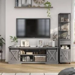 2 Door Farmhouse Highboy TV Stand For TVs Up To 65″ Gray Wash – Saracina Home