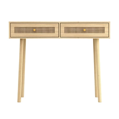 office. Two full-extension drawers are accented with a fine-weave rattan inlay and a gold pull.