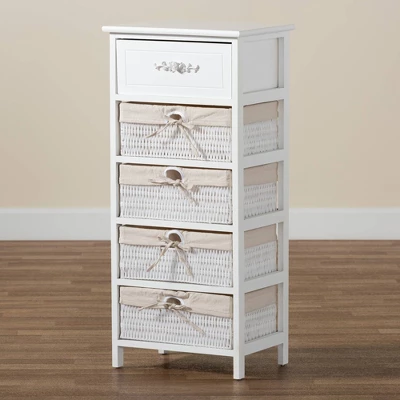 Charming with convenient utility, the Madelia storage unit adds an elegant accent to your space. Made in China, this handy piece is comprised of a sturdy wood frame fitted with baskets. One drawer adorned with a lovely molded handle and four baskets provide ample room to organize and declutter your interior. Comes fully assembled, the Madelia features fabric basket liners for an elegant, contemporary feel. A visually stunning and efficient addition, the Madelia storage unit elevates the character of any space. Overall Dimensions: 34.60″ High x 15.70″ Wide x 11.80″ Deep; Drawer Dimensions: 12.99″ Wide x 10.24″ Deep x 5.90″ High; Legs: 2.17″ High;