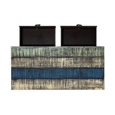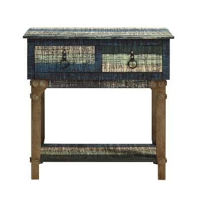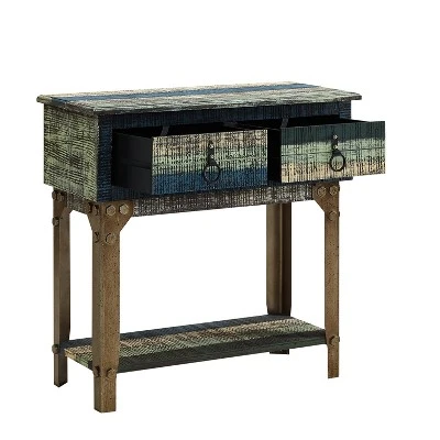 The Marley Collection combines an antique, weathered look with a warm, rustic, industrial feel. Its distressed look is trendy, popular, and full of unique character. The 2-Drawer Hall Console is a perfect addition to any area of your home. It features 2 deep upper drawers and a shelf below which provides ample storage space for a variety of items. Drawers feature antique bronze finished pulls with colored wood handles. Fully assembled. Easy to maintain, spot or wipe clean when necessary.