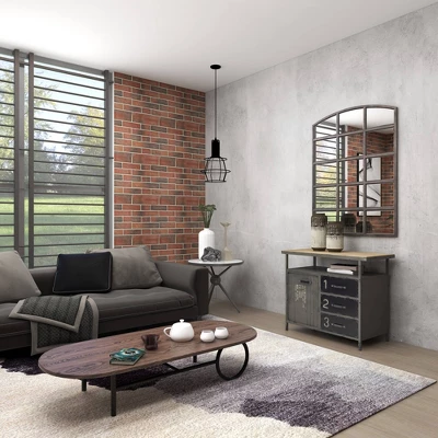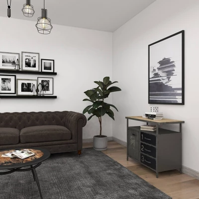 - Designed with rugged charm and edgy allure, where metal finishes and raw materials unite to create an urban aesthetic that showcases your artistic expressionIndustrial storage unit features a sturdy construction of iron and fir woodMetal cabinet storage carries natural wood brown top with gunmetal gray structure and black distressingRectangular metal dresser features open midsection shelf with a combination of spacious cabinet and drawers, curved handle bars for easy open and painted with repurposed-style script in white with heavily distressing designThis item measures 36L x 16.75W x 32.38H inches, and weighs 41.50 lbsThis distressed file cabinet carries a gray exterior and a rectangle silhouetteWipe clean with a dry clothThis distressed corner cabinet is formed by hammered metal sheets welded together to hold a wooden tabletop and pull-out drawers