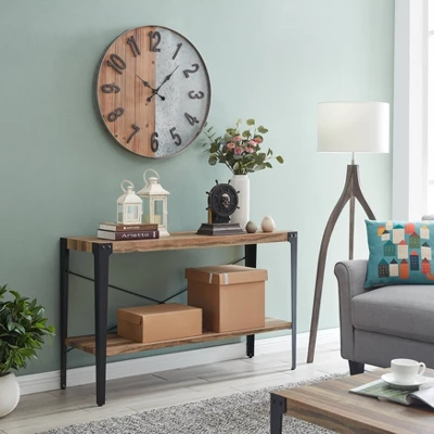 Offering rustic charm to living spaces, the Modern Industrial Console Table in Metal and Distressed Wood by Danya B. is masterfully crafted with a focus on contemporary design. Tapered metal legs display visible nail heads, while distressed finish wood stays true to its rustic design. The addition of a stretcher beam offers stability and visual interest. This rustic console is great for displaying books, magazines, and tabletop decor in a home or office.