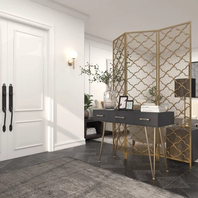 This 3-panel room divider is see-through but it can provide privacy with the addition of curtains or Japanese paper. Designed with felt or rubber stoppers at the base that prevent scratching furniture and table tops, as well as sliding around. This item ships in 1 carton. Suitable for indoor use only. Item features 3 panel screens. This is a single gold colored folding panel partition. Modern style.
