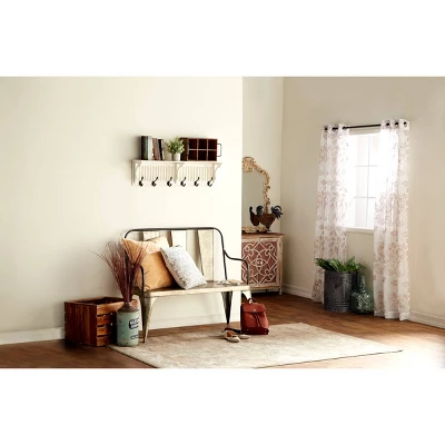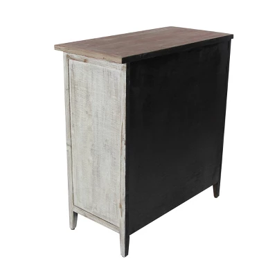 - •Carved wood cabinet carries a distressed whitewashed and brown wood finish with bright white knob handles