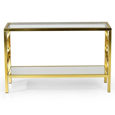 You will be spellbound by the stunning design of the Olympia collection. The gleaming gold chrome finish blends with the tempered glass top and mirrored base to create a sofa table unlike any other. The modern design and circular side design will be the highlight of your living space. Your purchase includes one sofa table.