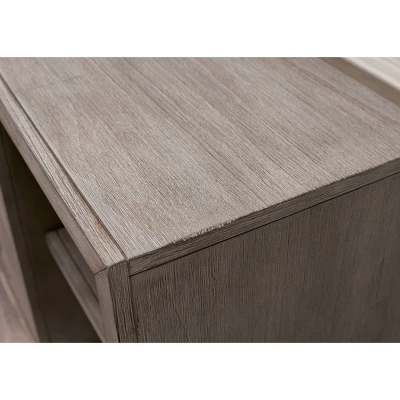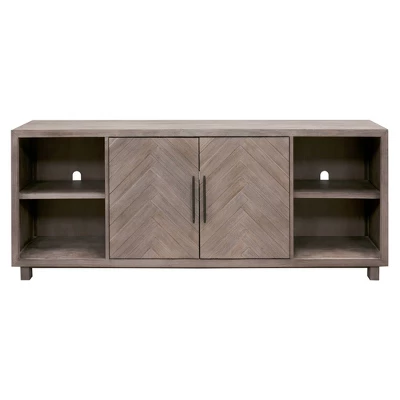 Palisades boasts transitional luxury with a touch of glam that fits perfectly with contemporary décor. Herringbone patterned door fronts with unique textured iron hardware lends an understated accent. Bushed gray finish has been distressed to highlight the woods natural grain. This item has three adjustable shelves and is delivered fully assembled.