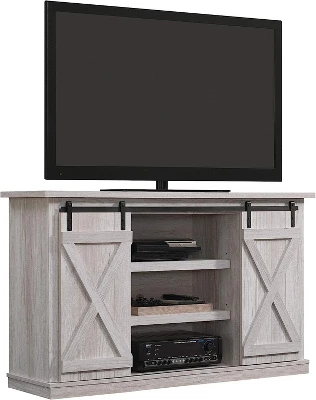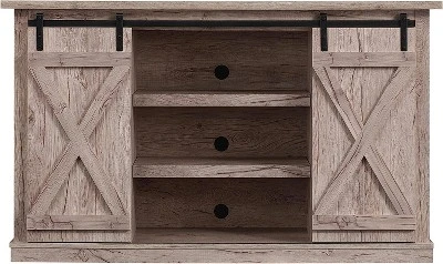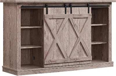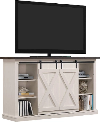 The Pamari Killian TV Stand Media Console is an elegant piece of cottage inspired decor. Farmhouse style barn-door cabinets feature “X” styled mullions that give a distinctive visual element to the door fronts. Fixed to a metal rail system, each door slides to reveal or conceal the contents of the cabinet. The Killian offers three open shelves, as well as two side cabinets that feature adjustable shelves for storage. The Killian cabinet fits televisions up to 60″ or 75 lbs making it the perfect home theater setup. Assembly is quick and easy with the included instructions. For added safety, tipping restraint hardware is included.